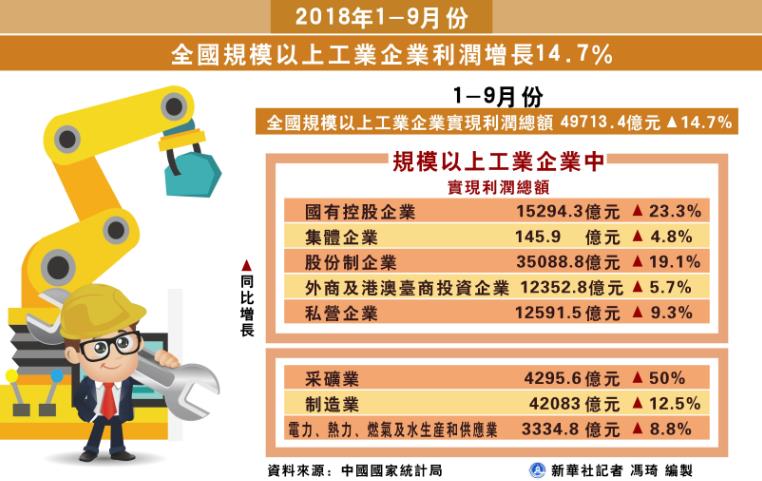 【香港商報网訊】國家統計局昨日發布數據顯示,2018年1-9月份,中國規模以上工業企業實現利潤總額49713.4億元(人民幣,下同),同比增長14.7%(按可比口徑計算),增速比1-8月份放緩1.5個百分點。