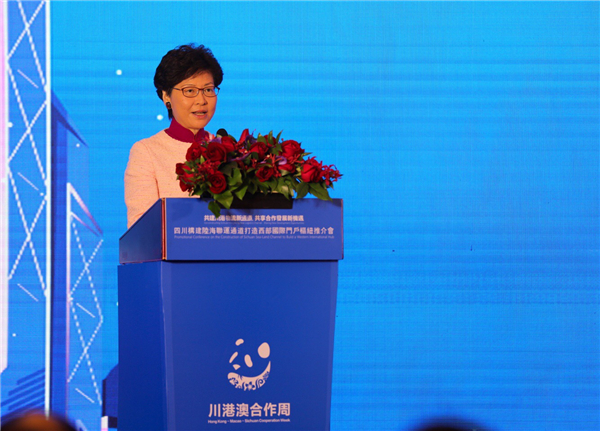 【香港商报网讯】記者邱媛媛報道:「川港澳合作周」首場活動「共建川港物流新通道共享合作發展新機遇—四川構建陸海聯運通道打造西部國際門戶樞紐推介會」今日(7日)在香港舉行。香港行政長官林鄭月娥出席活動致辭時表示,香港願發揮區域物流樞紐角色,為四川提供更多轉運服務;香港的廠商也可將生產線擴展到四川,利用四川新聯運通道開拓「一帶一路」市場。