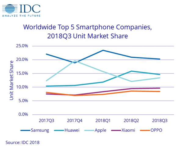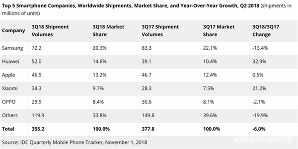 2018年第三季度全球智能手机出货量排名前五的厂商