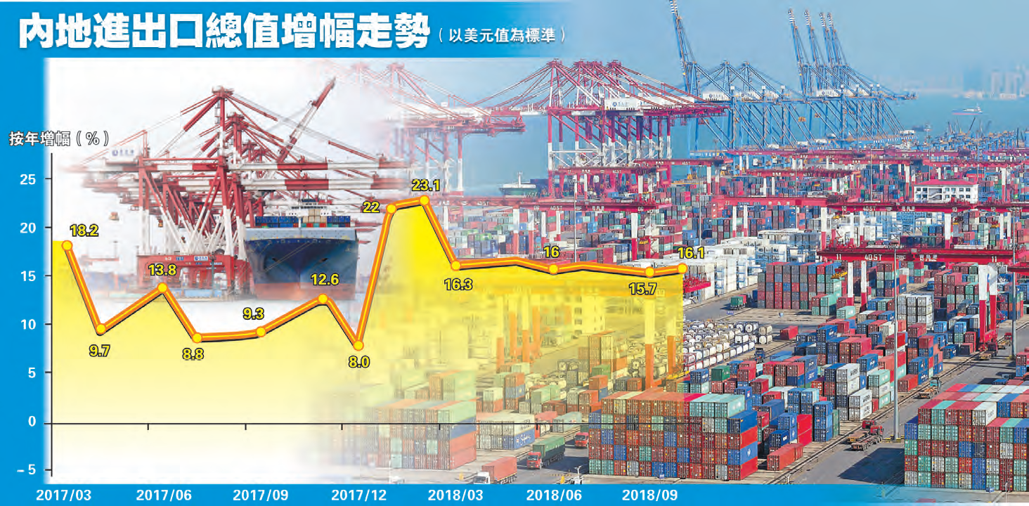 亦有市場分析師認為,內地進出口增速雙雙走高,是受進出口貿易行為前移、人民幣匯率貶值,及去年工作日比今年少1天和環保限產導致數據基數偏低等的影響,上述因素作用下,年內內地外貿高增長仍可持續,全年外貿增長高於10%已成定局;但是,展望明年,外貿形勢則很難樂觀,因中美貿易摩擦的不確定性以及中國和全球經濟增速都面臨下行壓力,疲弱的內外需可能給未來外貿形勢蒙上陰影。
