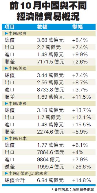 --民營企業所佔比重提升。前10月,民營企業進出口9.88萬億元,增14.6%,佔外貿總值的39.4%,按年升1.1個百分點。