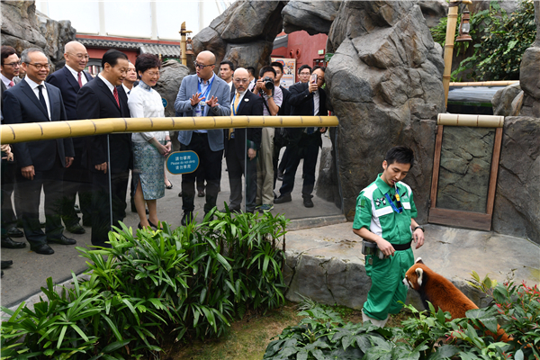 四川自然保護周昨日在海洋公園開幕。圖為行政長官林鄭月娥和四川省委書記彭清華(前排左一)探望園內小熊貓。