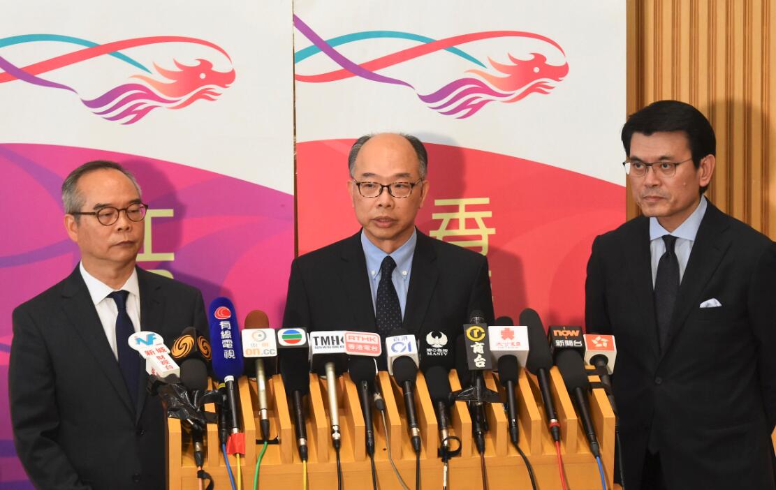 運輸及房屋局局長陳帆(中)、商務及經濟發展局局長邱騰華(右)、民政事務局長劉江華(左)昨日會見傳媒表示,政府已部署好大橋周末新安排以改善運作速度及效率。記者 蔡啟文攝