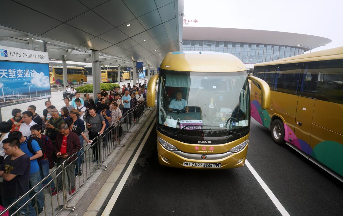 港珠澳大橋通車首日穿梭巴士準備載客出發。中通社