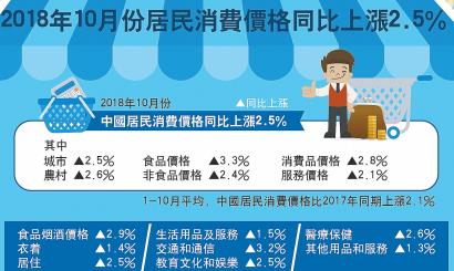 對於10月份CPI數據,國家統計局城市司高級統計師繩國慶稱,從同比看,CPI上漲2.5%,漲幅與上月相同。其中,食品價格上漲3.3%,影響CPI上漲約0.64個百分點;非食品價格上漲2.4%,影響CPI上漲約1.90個百分點。