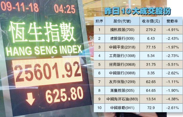 【香港商報网訊】記者林蓁芯報道:美國聯儲局暗示12月再加息,市場對美聯儲在上月市場波動後放緩加息步伐的希望落空,亞太股市受壓。港股三連升後,昨日受牽連向下,全日插625點或2.4%,收報25601點;主板成交額908.06億元。