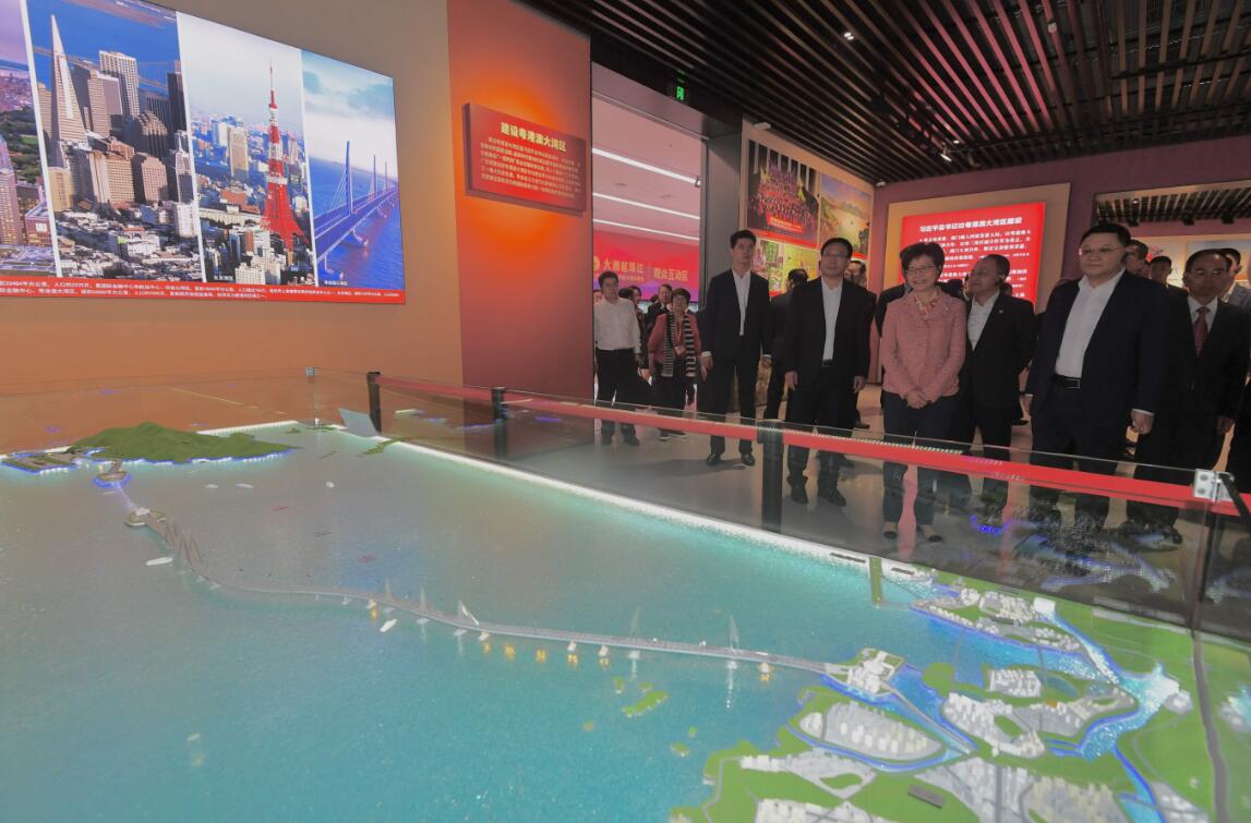 林鄭月娥、王志民、王偉中和代表團成員參觀港珠澳大橋模型。中新社