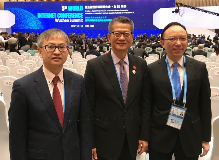 陳茂波(中)跟創新及科技局副局長鍾偉強(左)及政府資訊科技總監林偉喬(右)一同出席世界互聯網大會。