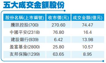 明天公布季績的騰訊繼續被大行唱淡,股價曾跌至270元;收報270.6元,跌3.1%,拖低恒指71點。由於內地當局持續規管遊戲行業,騰訊近日屢遭多間券商削減未來一至兩年盈利預測。市場普遍預測騰訊今年第三季非通用會計準則純利由按年持平至增長14%不等,平均值為187億元人民幣,按年僅升9.5%。