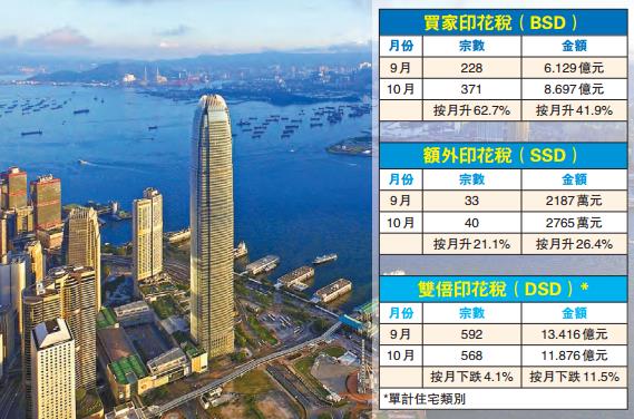 【香港商報网訊】記者呂婉玲報道:本地樓市轉弱,成交宗數下降。不過,稅務局最新數據顯示,10月樓市三辣稅總金額錄得升幅。涉及非香港永久居民的買家印花稅(BSD)交易錄371宗,稅款共8.69億元,按月分別上升62%及41%。有學者認為,數據反映內地買家佔比上升。另一方面,向短期轉售物業人士徵收的額外印花稅(SSD)宗數及金額錄21%及26%升幅,顯示買家寧願硬啃稅款,也要盡早入市。