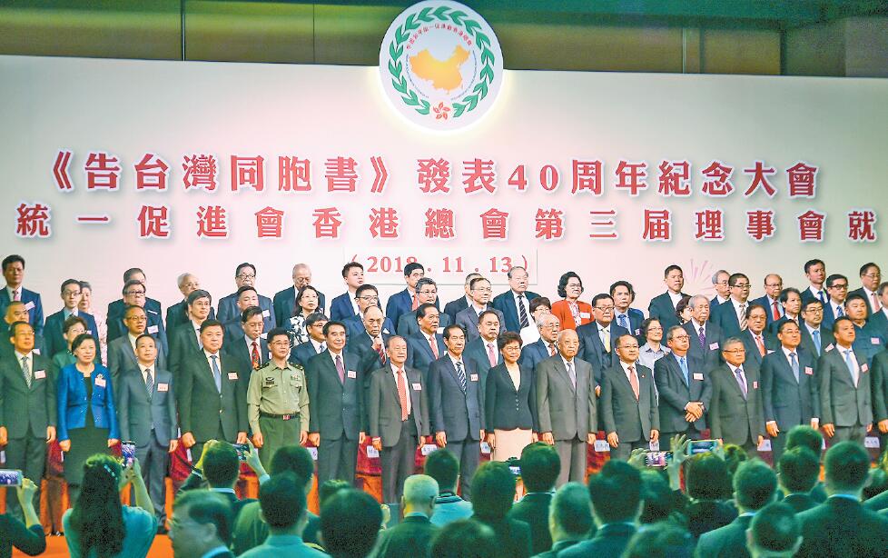 【香港商報网訊】據新華社報道,《告台灣同胞書》發表40周年紀念大會昨日在香港舉行。全國政協副主席董建華,香港特別行政區行政長官林鄭月娥,中央政府駐港聯絡辦主任王志民,全國台聯會長黃志賢,中央台辦副主任陳元豐,國務院港澳辦副主任黃柳權,外交部駐港特派員公署特派員謝鋒,中央政府駐港聯絡辦副主任楊建平。中國人民解放軍駐港部隊副政委陳亞丁,全國僑聯副主席李波、余國春和盧文端等出席大會。新黨主席郁慕明、無黨團結聯盟主席林炳坤等台灣嘉賓應邀與會。