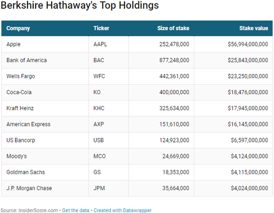 以下为伯克希尔的十大重仓股: