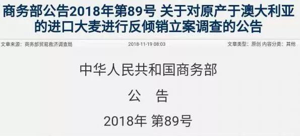 公告内容显示,商务部于2018年10月9日收到中国国际商会代表国内大麦产业正式提交的反倾销调查申请。根据申请人提供的证据和商务部的初步审查,商务部决定自2018年11月19日起对原产于澳大利亚的进口大麦进行反倾销立案调查。