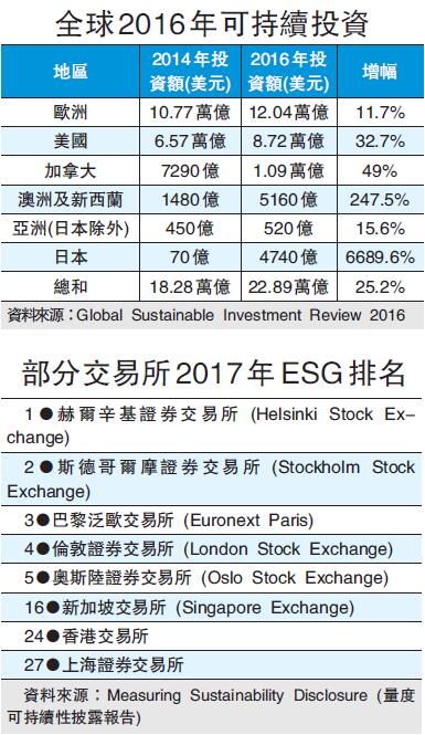 所謂ESG,是指把環境、社會及管治元素考慮在內的投資方式。報告引述《2016年全球可持續投資回顧》(Global Sustainable Investment Review 2016)指,全球符合上述可持續投資策略管理的資產總值達22.9萬億美元,較2014年增加25%,而香港只佔約0.06%,即135億美元。以日本為例,可持續投資策略管理資產從2014年的70億美元,增至2016年的4740億美元。
