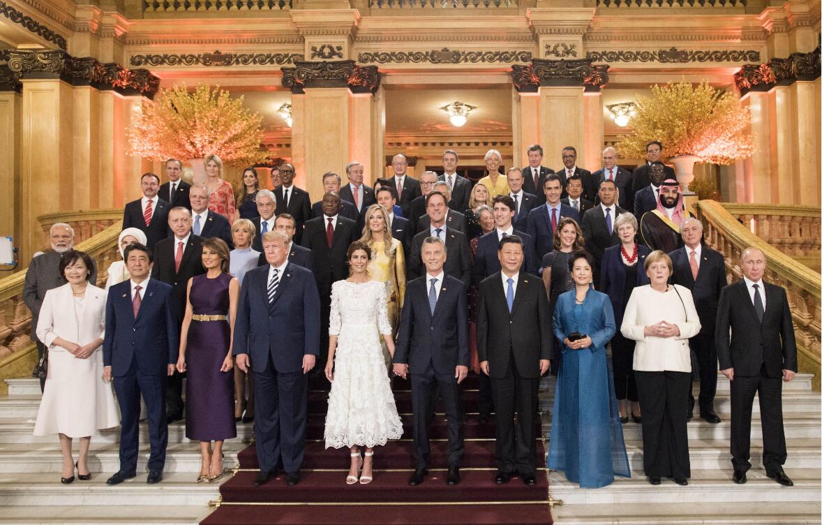 當地時間11月30日,国家主席习近平和夫人彭丽媛同出席20国集团领导人峰会的各代表团团长夫妇集体合影。