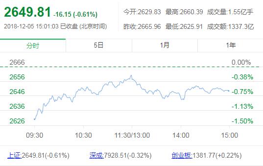 12月5日消息,两市早盘集体低开,随后震荡上行,创业板指盘中一度翻红,午后稍有回落,沿平盘线窄幅震荡。从盘面来看,受市场传言“海南正推动赛马运动”刺激,赛马概念股午间强势崛起,罗牛山(9.410, 0.40, 4.44%)盘中直线拉升封板,午后有所回落,ST板块尾盘走强,超10股涨停,知识产权保护、猪肉、赛马、ST、白酒、海南等板块涨幅居前,园区开发、创投、保险、券商、造纸、物流等板块跌幅居前。截止收盘,沪指报2649.81点,跌幅0.61%,深成指报7928.51点,跌幅0.32%;创指报1381.77点,涨幅0.22%。