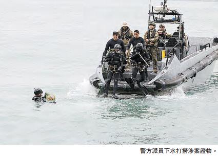 昨午2時許,大批重案組探員抵達發現死者的現場一帶調查,部分探員在岸邊搜索,飛虎隊「水鬼隊」人員奉召乘坐小艇出海打撈涉案證物,稍後疑犯被押至華貴對開岸邊協助調查,3名蛙人根據疑犯所指方向落水,終在距離岸邊5至10米撈起一個藍色行李篋,篋上附有牛皮膠紙,相信是用作藏屍。警方將行李篋檢走,疑犯逗留約半小時後離開。