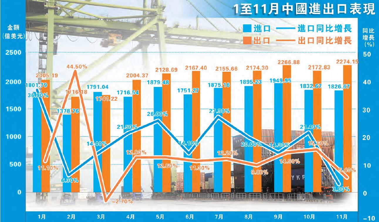 按美元計價,前11個月,中國進出口總值4.24萬億美元,增長14.8%。其中,出口2.27萬億美元,增長11.8%;進口1.97萬億美元,增長18.4%;貿易順差2995.9億美元,收窄18.1%。11月份,中國進出口總值4100.8億美元,增長4.3%。其中,出口2274.1億美元,增長5.4%;進口1826.7億美元,增長3%;貿易順差447.4億美元,擴大16.4%。