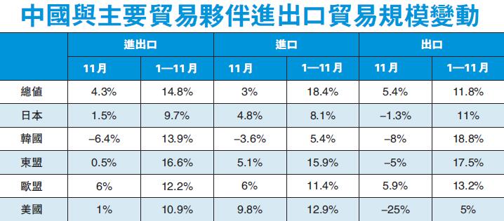 【香港商報网訊】中國海關總署昨日公布中國11月的外貿數據,其中,按美元計,中國11月進口按年增長3%,出口按年增長5.4%,雙雙不及市場預期,且較上月增速大幅放緩。11月貿易順差擴大16.4%,其中對美順差按年增27.5%。今年以來,貿易順差整體收窄18.1%。分國別看,11月當月,中國對美出口大幅下跌25%,對韓國外貿有明顯萎縮,對歐盟出口按年升5.9%,為主要貿易夥伴中唯一出口擴大的地區。