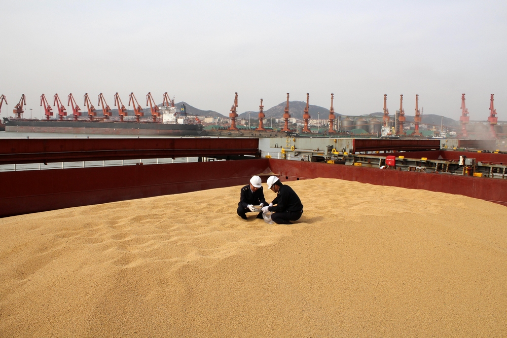11月中国大豆进口下滑38%。图为内地检验检疫局人员抽检来自美国的进口大豆。