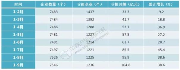 据中商产业研究院数据显示:截止2018年9月底,我国医药行业规模以上企业数量达到7546家,其中亏损企业数量1236家,亏损面16.4%,较上个月提高了0.1个百分点,2018年前9个月医药行业亏损总额104.8亿元,累计同比增长38.6%。平均每家药企约亏损850万元。