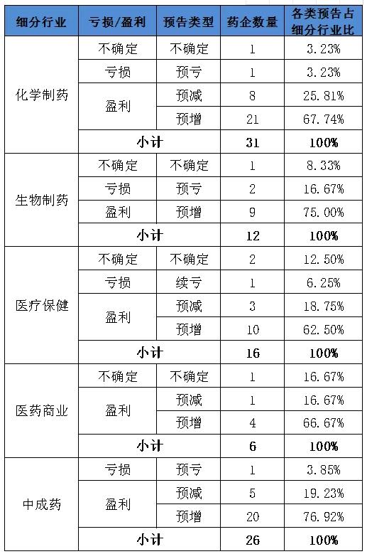 需要注意的一个现象是在盈利的企业中,除生物制药细分行业外,其余细分行业预告盈利的企业中预减企业占比也较高。化学制药、医疗保健、医药商业和中成药预减合计占细分行业的比例分别为25.81%、18.75%、16.67%和19.23%。