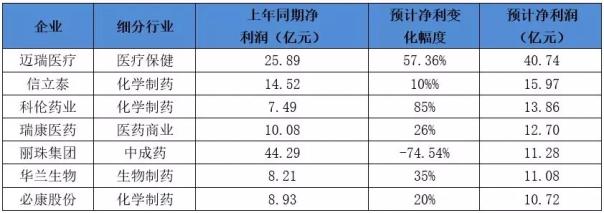 盈利的88家企业中(翻至文末查看81家盈利企业业绩全貌),有迈瑞医疗、信立泰、科伦药业、瑞康医疗、丽珠集团、华兰生物、必康股份等7家药企预告全年净利润在10亿元以上。其中,迈瑞医疗是继药明康德从美股私有化退市返回A股的第二家“独角兽”公司,业绩全年净利增长近6成,全年净利超40亿元。