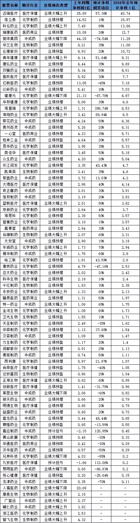 截至目前,据同花顺统计数据显示,已有91家药企(约占A股上市公司的1/3)发布了2018年全年业绩预告,其中预计亏损的企业为5家,亏损面约为5.5%,盈利的企业为81家,约为89%,不确定的企业为5家。