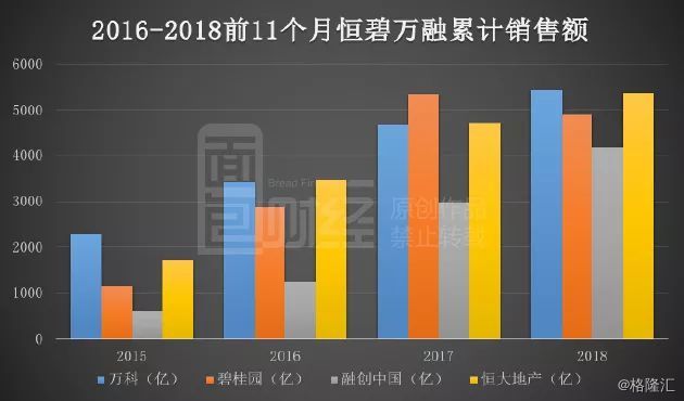 2018年前11个月,恒大、碧桂园、万科和融创的累计销售总额创出历史新高。以下为2016年至今前11个月恒碧万融的累计销售额变动图: