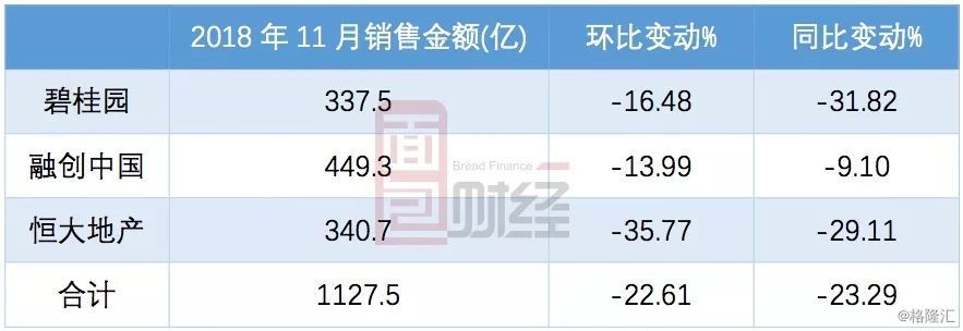 单看11月的销售数据,除万科还在继续增长外,恒大、碧桂园和融创的销售额环比和同比均出现了下降。