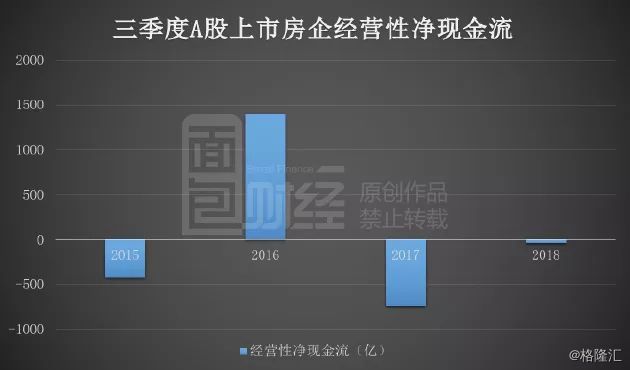 从上图来看,截至三季末A股上市房企的经营性现金流合计流出33.23亿元,虽然较2017年同期相比净流出大幅减少,但仍然处于净流出状态。