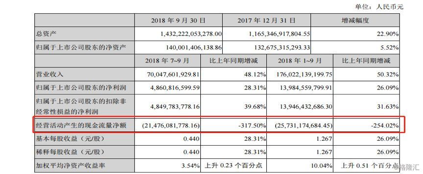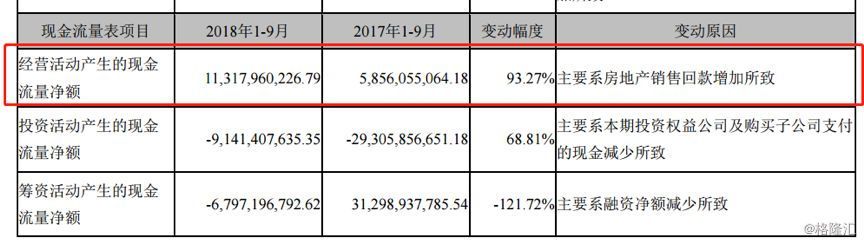 先重温一下三季报的数据。根据wind数据统计,申万行业分类标准下,房地产开发行业2018年三季报合计经营性净现金流为净流出。