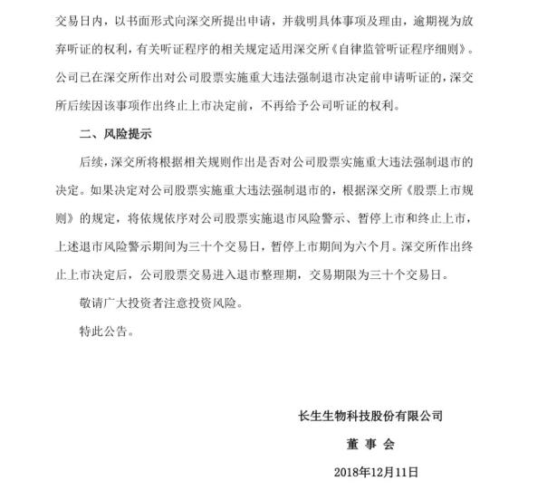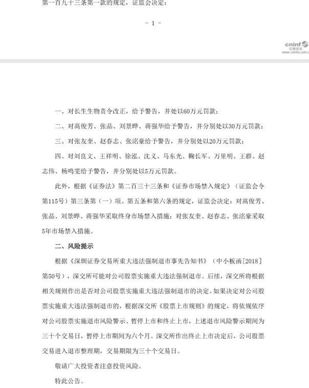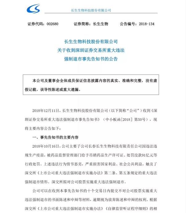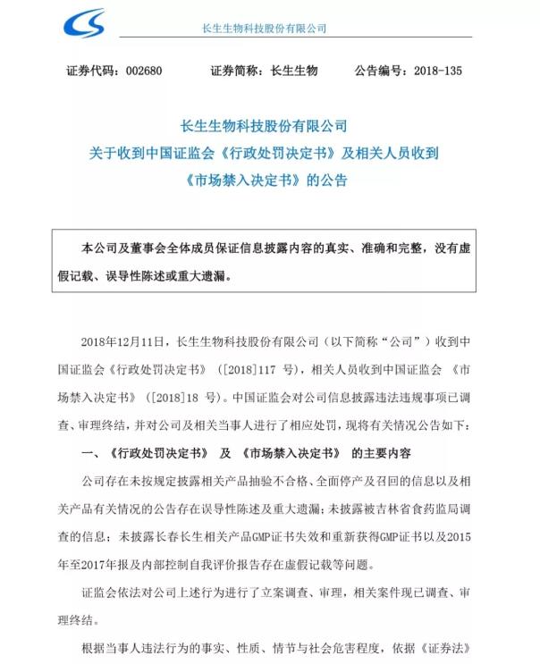 说回此次强制退市和禁入的公告。在公告里,长春长生称“长生生物存在未按规定披露相关产品抽验不合格、全面停产及召回的信息以及相关产品有关情况的公告存在误导性陈述及重大遗漏;未披露被吉林省食药监局调查的信息;未披露长春长生相关产品GMP证书失效和重新获得GMP证书以及2015年至2017年报及内部控制自我评价报告存在虚假记载等问题”,而“已在深交所作出对公司股票实施重大违法强制退市决定前申请听证,深交所后续因该事项作出终止上市决定前,不再给予其听证的权利”;而对于公司主要高管,处罚款外,“对高俊芳、张晶、刘景晔、蒋强华采取终身市场禁入措施”。长春长生也成为A股有史以来第一家因为重大违法行为而被强制退市的公司。