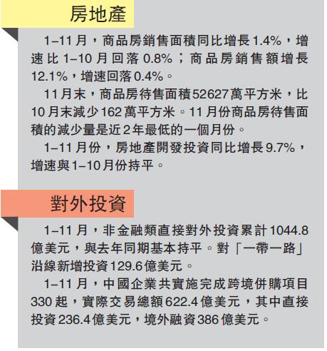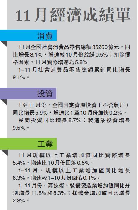 【香港商報网訊】記者黃鶯 見習記者廖非凡报道:由於內外部各種因素疊加,中國經濟增長動力在11月份進一步減弱。統計局昨日數據顯示,11月消費和工業產出都呈現弱勢,固定投資和房地產投資相對穩定。值得注意的是,11月「消費馬車」明顯疲軟,雖有「雙11」的「助攻」,但其增速卻降至2003年3月以來最低。專家認為,11月宏觀數據有喜有憂,喜的是投資增速逐漸回升,憂的是內外需求仍在走弱,並傳導到生產放緩。儘管經濟存在一定下行壓力,但全年實現6.5%左右的增長目標並無懸念。