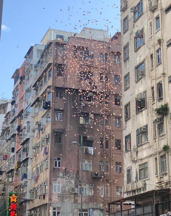 深水埗站黃金商場外,昨日有大批百元紙鈔由附近天台撒下。
