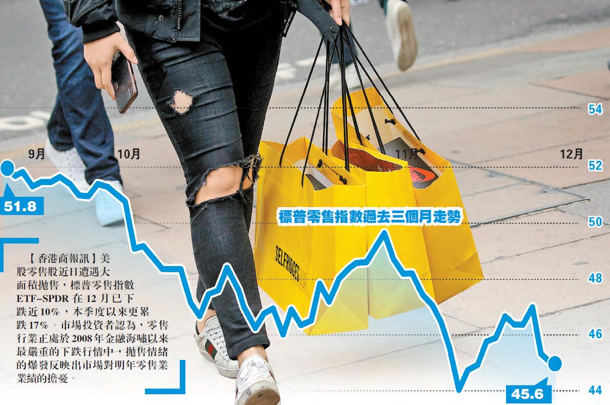【香港商報网訊】美股零售股近日遭遇大面積拋售,標普零售指數ETF-SPDR在12月已下跌近10%,本季度以來更累跌17%。市場投資者認為,零售行業正處於2008年金融海嘯以來最嚴重的下跌行情中,拋售情緒的爆發反映出市場對明年零售業業績的擔憂。