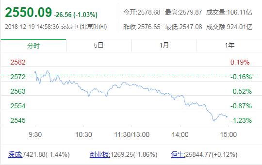 12月19日消息,早盘三大股指小幅高开,随后指数震荡走弱。房地产板块一度带动主板指数冲高,但石油化工的颓势拖累了大盘。随后,医药板块个股集体杀跌,三大股指小幅跳水,创业板指一度跌1%,经过5G、地产等板块弱势逞强,但大盘表现依旧弱势。临近上午收盘,沪指、创指出现反弹迹象,但总体上做多资金观望情绪依旧浓厚。市场整体赚钱效应依旧不振。早间一度冲高的创投板块有所回落。另外,更多不确定消息依旧影响地产股走势。午后,消息影响,午后三大股指单边下行,资金做多情绪不佳。市场仅ST板块较为强势,市场依旧缺乏热点。总体股指缩量震荡,市场赚钱效应较差。尾盘,尽管创投板块逆势拉升,但三大股指快速下跌,创指跌超2%,沪指跌超1%,上证50指数(2369.5483,-28.32, -1.18%)逼近平台低点,资金谨慎情绪再度攀升。截止收盘,沪指报2549.56点,跌1.05%,深成指报7418.69点,跌1.48%;创指报1268.81点,跌1.90%。