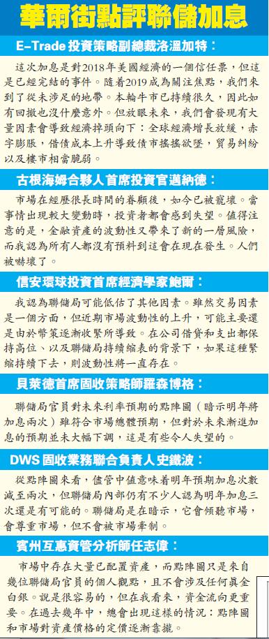 E-Trade投資策略副總裁洛溫加特:這次加息是對2018年美國經濟的一個信任票,但這是已經完結的事件。隨着2019成為關注焦點,我們來到了從未涉足的地帶。本輪牛市已持續很久,因此如有回撤也沒什麼意外。但放眼未來,我們會發現有大量因素會導致經濟掉頭向下:全球經濟增長放緩,赤字膨脹,借債成本上升導致債市搖搖欲墜,貿易糾紛以及樓市相當脆弱。