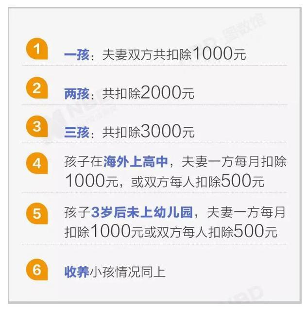子女从满3周岁至教育结束,不论处在什么教育阶段,不论是在中国境内还是境外接受教育,均可按照每个子女/月扣除1000元,或由夫妻双方每人各扣除500元计算。