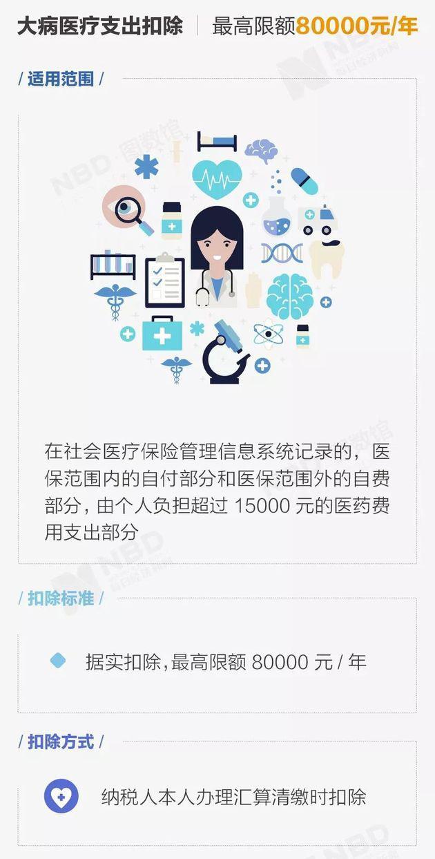 在一个纳税年度,纳税人医保报销后个人负担(医保目录的自付部分)累计超过15000元的部分,在80000元限额内据实扣除。