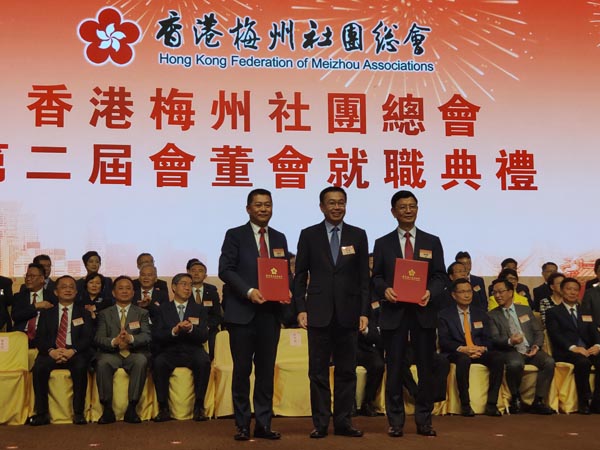 【香港商報網訊】香港梅州社團總會第二屆會董會就職典禮日前舉行,中聯辦副主任何靖、廣東省政協副主席林雄、外交部駐港副特派員趙建凱、民政事務局副局長陳積志、廣東省港澳辦主任廖京山、省委統戰部副部長黃強、梅州市委書記陳敏等蒞臨主禮。梁亮勝連任主席,曾智明連任執行主席。