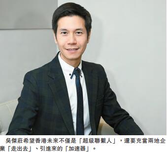 吳杰莊認為,香港作為「超級聯繫人」,加速聯繫才有用,「加速」是香港未來非常重要的作用。他說,「一些內地的優秀企業,如果想去國際市場試一試,自己去敲門可能要三天,發個短信給我,三分鐘就能搞定」。