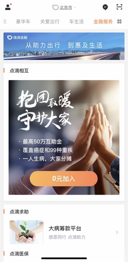 【香港商报网讯】1月2日,滴滴“金融服务”频道在滴滴产品端低调上线。产品包括名为“点滴相互”的重大疾病互助产品、大病筹款产品“点滴求助”,以及健康险、理财、车险等板块。据悉,目前滴滴金融服务所呈现的业务均有合规牌照。这是自2018年滴滴金融事业部成立以来,首次集中对外呈现产品板块。