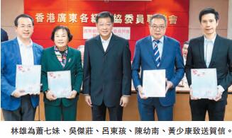 隨后,林雄致送賀信,祝賀蕭七妹、吳杰莊、呂東孩獲頒榮譽勋章;陳幼南獲頒銀紫荊星章;黃少康獲委任太平紳士。戴德豐代表港區委員致送賀匾。