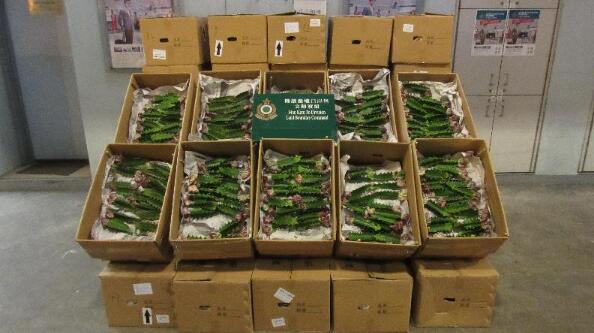 海關人員在文錦渡管制站一個貨櫃內檢獲約5000棵懷疑受管制仙人掌,估計市值約40萬元。海關提供
