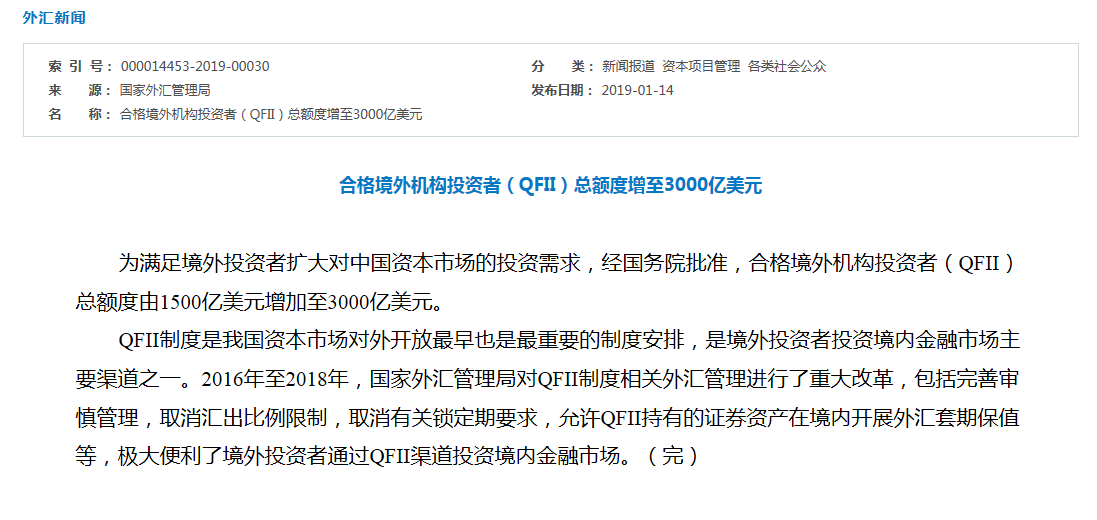 外汇局:合格境外机构投资者(QFII)总额度增至3000亿美元