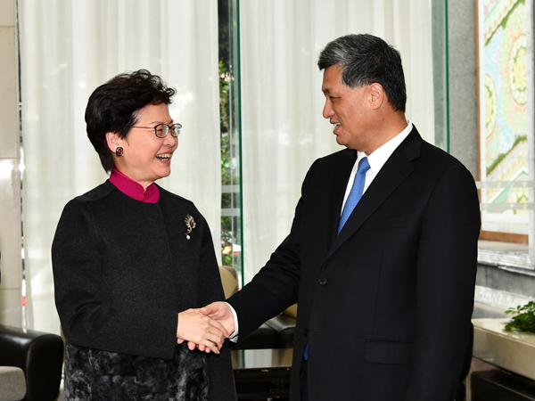 林鄭月娥在會晤時指,2018年是粵港澳大灣區建設開局非常成功的一年。去年,她與李希書記有過3次會晤,分別在北京、廣州和香港。她表示,與廣東省委書記如此緊密商談事務,可能是前所未有的。她十分感謝廣東省領導對粵港合作和粵港澳大灣區建設的支持。