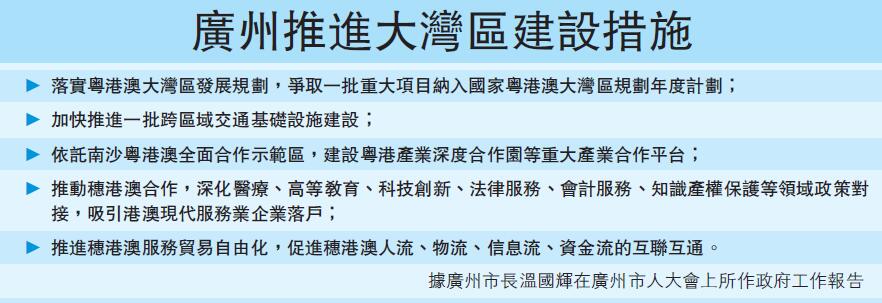 溫國輝報告稱,廣州要充分發揮粵港澳大灣區核心引擎作用,建立健全工作架構,完善穗港、穗澳對接合作機制,攜手港澳建設國際一流灣區和世界級城市群。他提出的舉措中包括,共建灣區科技金融服務中心、文化中心、國際貿易中心、大數據中心,推進設立廣州創新型期貨交易所、粵港澳大灣區商業銀行,建設國際金融島。