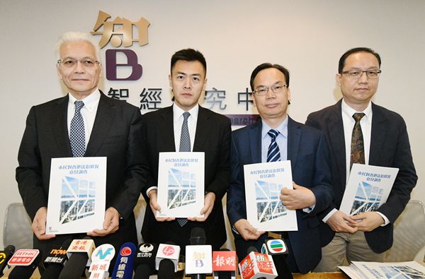 智經研究中心昨日發表《市民對香港法治狀況意見調查》結果。圖左起:智經研究中心理事李金鴻、智經研究中心副主席劉鳴煒、中大學者鄭宏泰及沈圃祥。