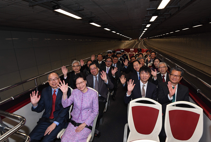 工程歷經近10年,中環及灣仔繞道和東區走廊連接路將於今日(20日)上午8時首階段通車。特區政府特別於昨早11時在新通道的中環隧道出入口舉行了通車儀式,特首林鄭月娥與其他一眾主禮嘉賓,包括財政司司長陳茂波、立法會主席梁君彥、行政會議非官守議員召集人陳智思、運輸及房屋局局長陳帆、交通諮詢委員會主席張仁良、運輸及房屋局常任秘書長(運輸)黎以德、運輸署署長陳美寶及路政署署長陳派明,專程乘坐開篷雙層巴士經新通道到達會場。